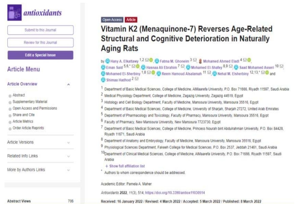 Une nouvelle étude menée sur des rats apporte des preuves que la vitamine K contribue à prévenir le déclin cognitif associé à la maladie d'Alzheimer et à d'autres formes de démence. Cette étude a été publiée le 8 mars 2022 dans la revue Antioxidants.
